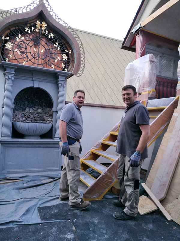 Auf Grundlage von alten Postkarten und Fotos wurden die filigranen Fachwerkkonstruktionen, die Holzbalkendecken und die Dachkonstruktion von den erfahrenen Holzbildhauern, Restauratoren, Tischlern, Zimmerern und Techniker aus dem Lippischen nachgebaut.